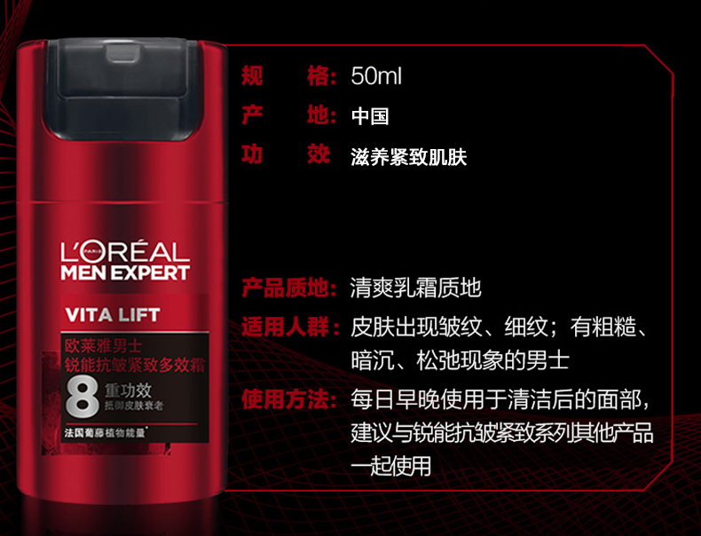 商品名称:欧莱雅男士锐能抗皱紧致多效霜 50ml*1瓶