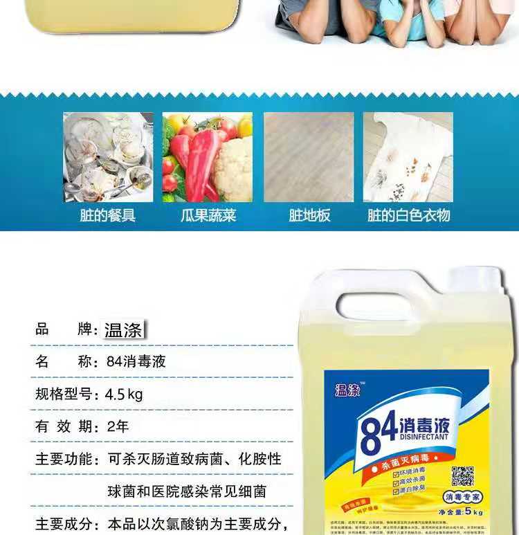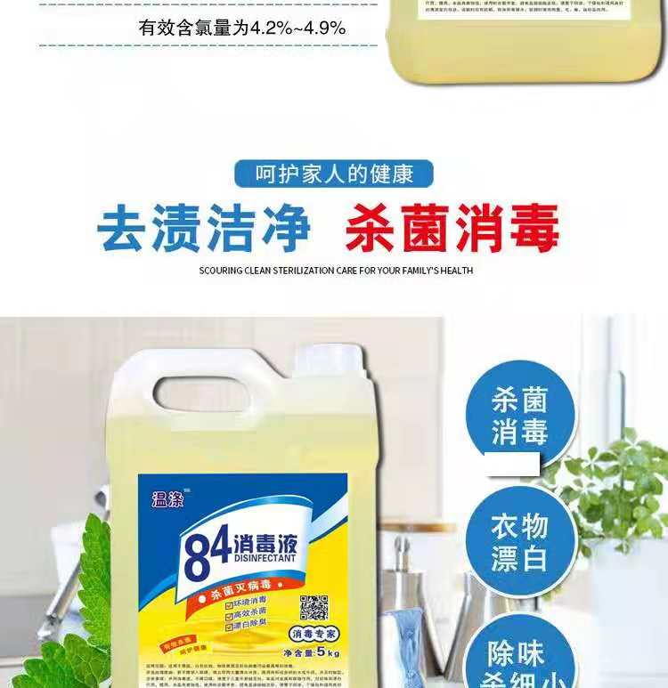 现在由于快递限制,货品只能是4.6公斤左右消毒液可以去霉除臭清洁地板漂白消毒预防疾病等作用。84消毒液属于高浓度产品,一定要用水稀释后才可以使用,具体看标签说明。