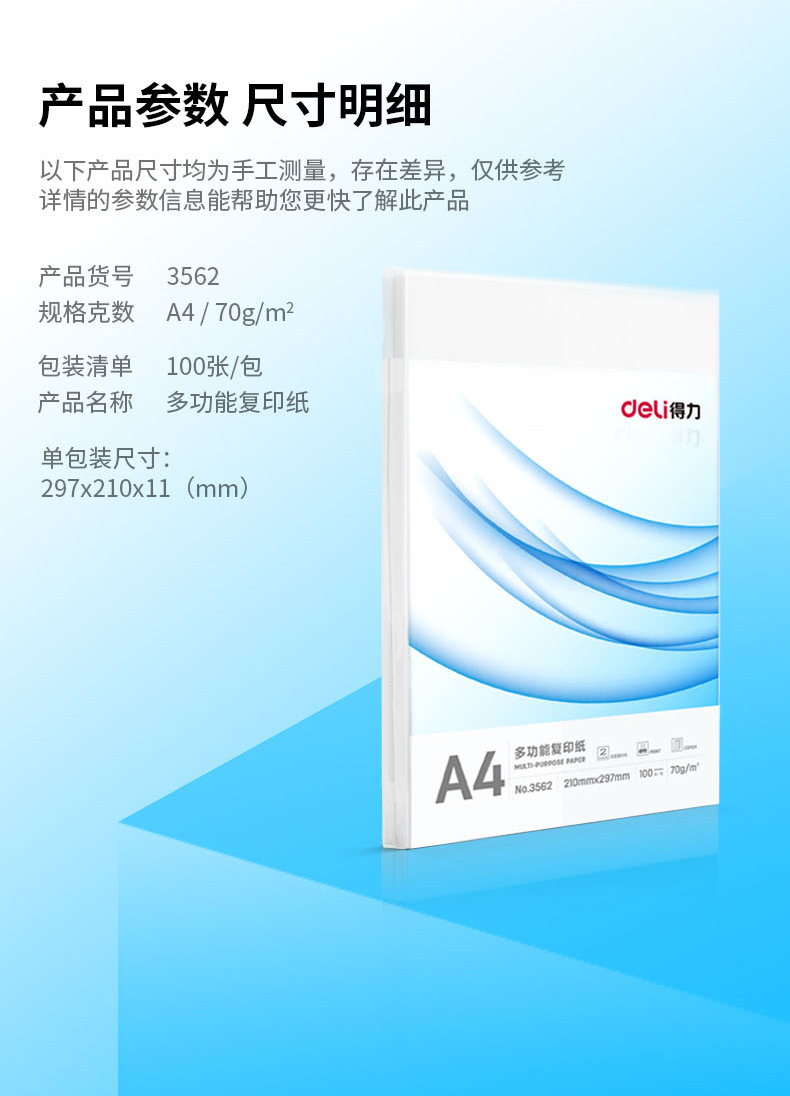 商品名称:得力A4打印纸复印纸单包100张办公用品70g加厚草稿纸学生用deli演草纸整包a4纸白纸实惠装批发包邮