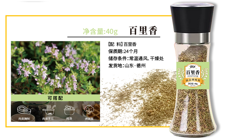 商品名称:百里香碎40g/瓶【带研磨】